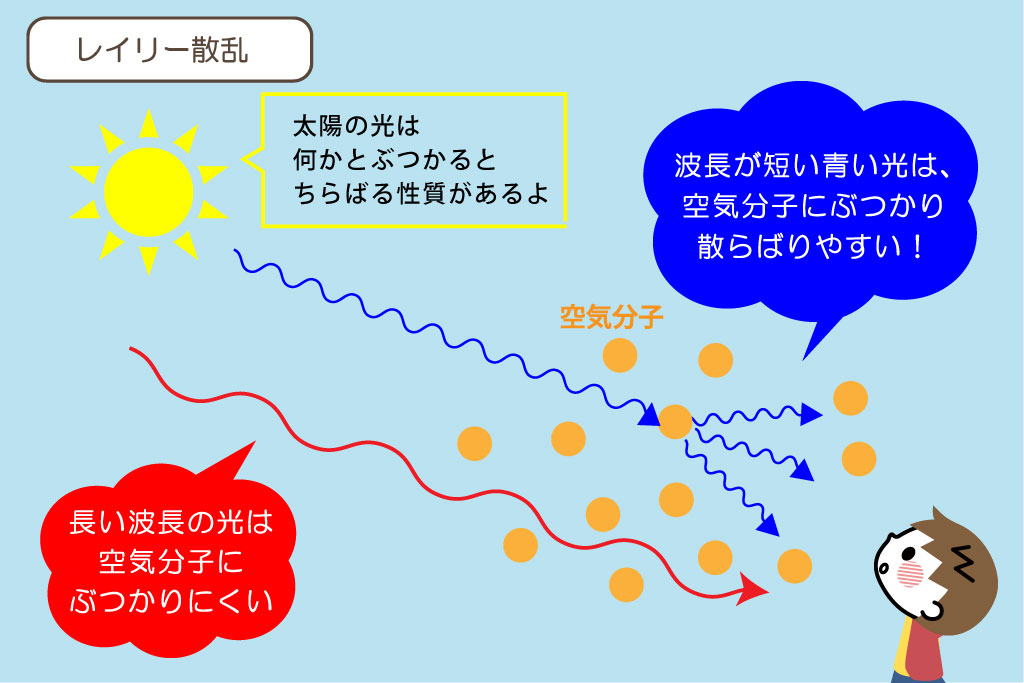 光は、何かとぶつかると散らばってあちこちに広がる性質があり、これを散乱といいます。特に、太陽の光の中でも波長の短い青い光は、酸素や窒素などの小さい分子とぶつかって強く散りやすい性質があります。これをレイリー散乱といいます。つまり、レイリー散乱が起こっていることで空は青く見えるのです。