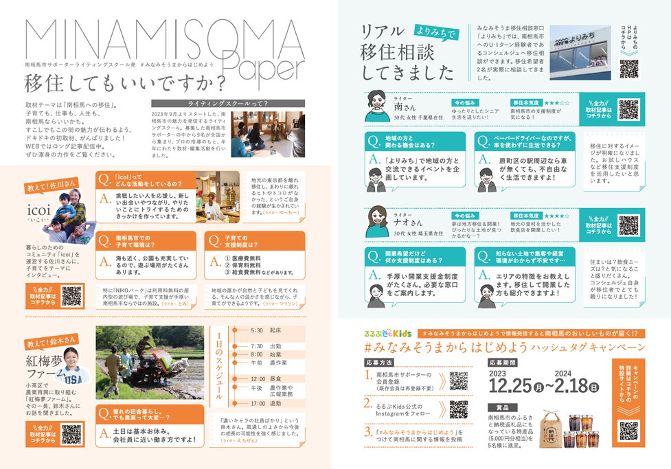 昨年大好評だった「南相馬市サポーターライティングスクール」が今年も開講決定しました。紙媒体とWEB媒体両方の制作を、企画から取材、校了までプロが実践的にレクチャー。フリーランスで活躍できるライター的スキルはもちろん、開催地である福島県南相馬市の魅力を伝えるなかで、SNSを中心とした現代に必要な情報発信スキルを身につけます。