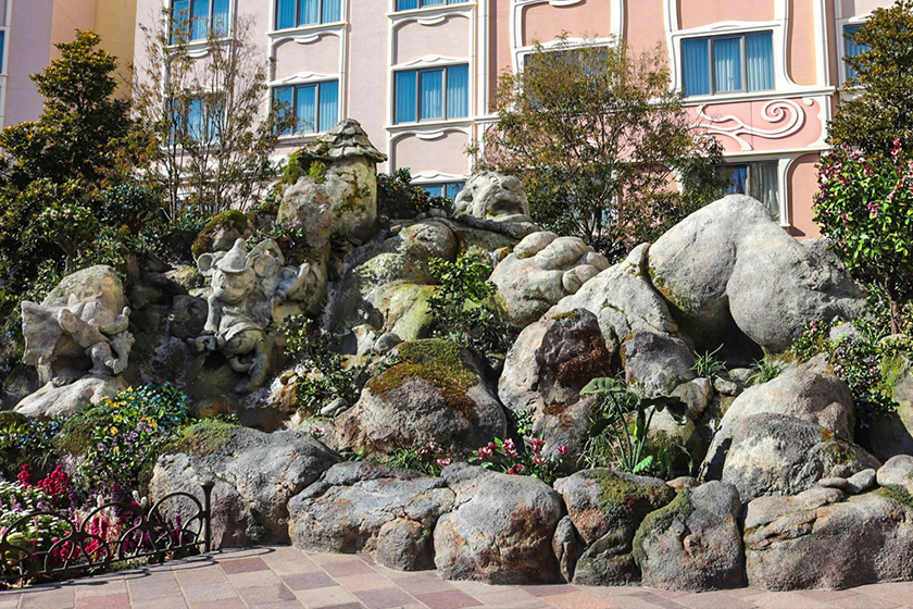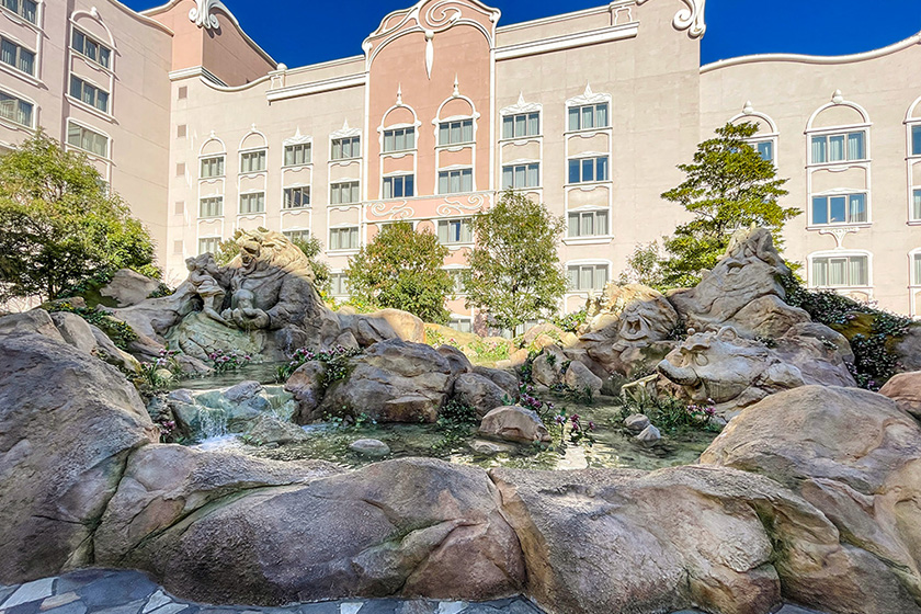 東京ディズニーシーのテーマポート「ファンタジースプリングス」には、ディズニー映画をテーマにした魔法の泉がたくさんあり、人気のフォトスポットになっています。当面の間は宿泊者だけが入れるホテルの敷地内にも、エントランスにディズニー映画『ミッキーの巨人退治』、中庭にはディズニー映画『美女と野獣』の魔法の泉があります。