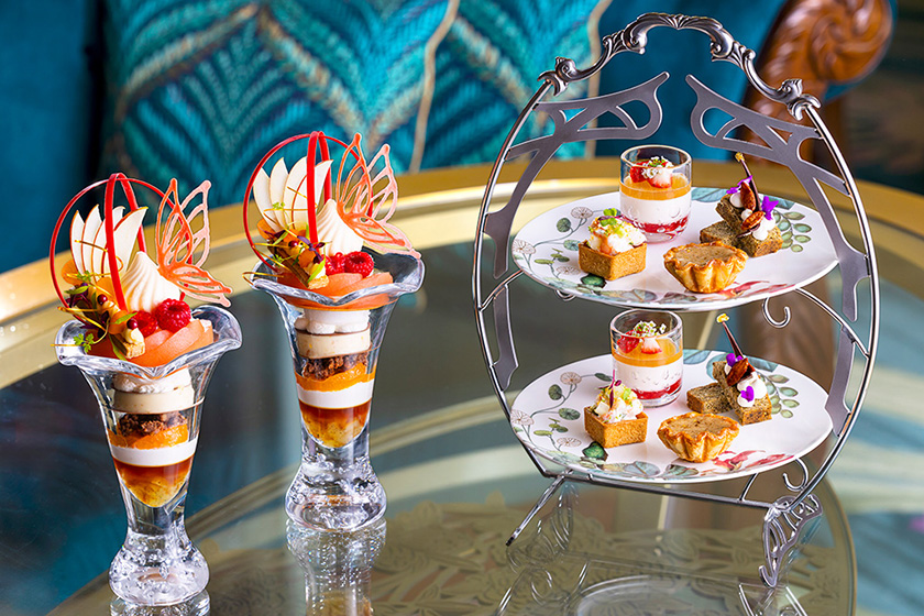 こちらでは「ケーキセット」2800円~のほか、「デザートセット」5000円(写真は2セット分)や、「パフェ・オ・ショコラ」3500円などが味わえます。