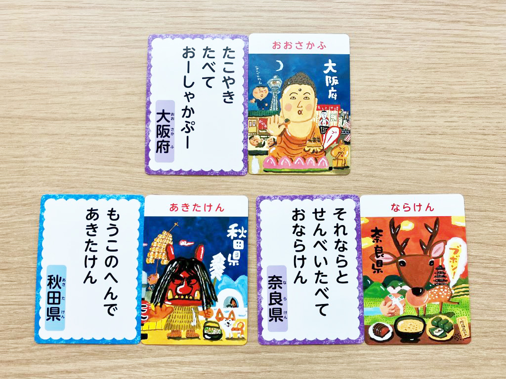 遊んでいると、「大阪は絶対とるって決めてた!」、「奈良は鹿の絵が描いてあるからわかった!」など、都道府県に関する話題も。耳馴染みのよいだじゃれと、それぞれの名物がちりばめられたイラストで、遊んでいるだけでも都道府県を自然とおぼえてしまいます。
