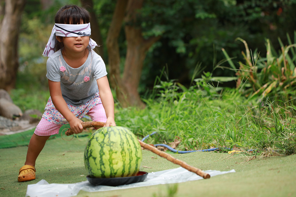 夏のバーベキューで盛り上がるのがスイカ割り。ゲーム感覚で楽しめて、最後にはみんなでおいしいスイカを食べられる、アウトドアならではの楽しみです。