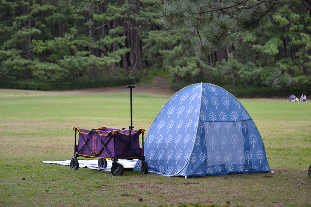 暑さ対策として日よけにも使えるほか、急な雨の避難場所としても。ワンタッチテントは、子どもの着替えの際にも役立ちます。