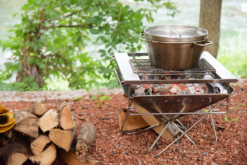 焚き火台は焚き火のほか料理をするのにも使えて一石二鳥のアイテム。バーベキューグリルがなくとも、ファミリーキャンプであれば焚き火台とコンロがあれば十分です。
