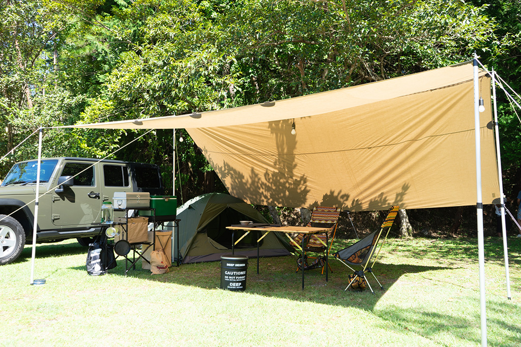 日差しを防いでくれるタープは雨除けにもなるのでテントとセットで設営を。