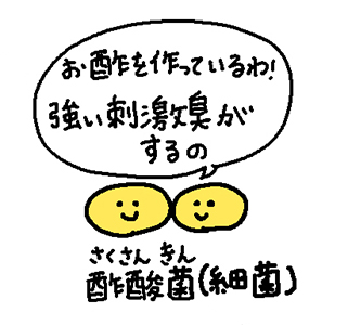 アルコールを発酵させて酢酸を生み出し、お酢を作るのに欠かせない酢酸菌(さくさんきん)。空気中に浮いているほか、梅・ぶどうなどの実、柿やりんごの皮などに棲んでいます。ツーンと刺激的な匂いが特徴で、食べ物が腐るのを防ぐ働きや、悪い菌をやっつける働きがあります。お寿司やピクルスを作るときお酢を使うのは、食べ物を腐らせず長持ちさせるためなのです。