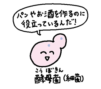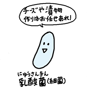 乳酸菌(にゅうさんきん)は、甘いものをすっぱく、さわやかな味にする細菌です。腸内環境を整え、体を元気にしてくれます。種類は違いますが人間の腸内にもいるんですよ。食中毒を引き起こす悪い細菌の増殖を抑える働きもあり、ビフィズス菌、シロタ菌などの名前は聞いたことがあるのでは?ヨーグルトやチーズに利用されるほか、味噌、キムチやぬか漬けなどの漬物作りにも大活躍しています。
