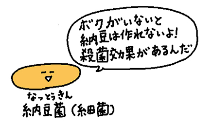 納豆菌は、その名のとおり納豆のネバネバや独特な香りを作るユニークな細菌です。「枯草菌(こそうきん)」とも呼ばれ、枯れた草や土の中、特に稲わらにたくさん棲んでいます。納豆菌の起源は諸説ありますが、平安時代に煮た大豆を冷まさずに稲わらに包み、馬にくくりつけて持ち歩いたらネバネバになってしまった……!そうして“偶然見つかった”発酵食品が納豆、ともいわれています。