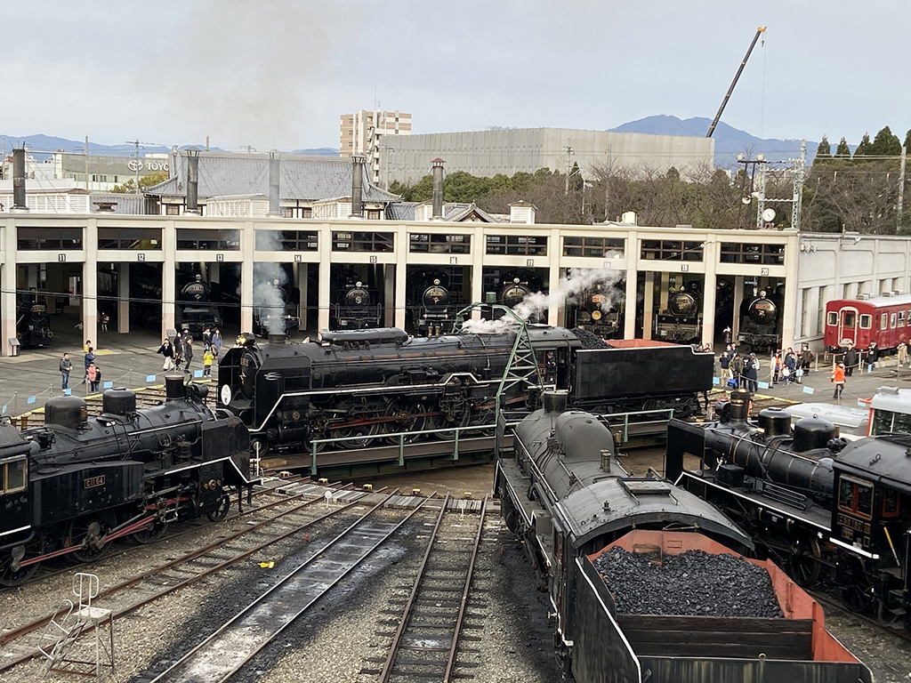 現存する日本最古の鉄筋コンクリート造りの扇形車庫に、蒸気機関車約20両を保存・展示。ずらりと並ぶ姿は圧巻です!