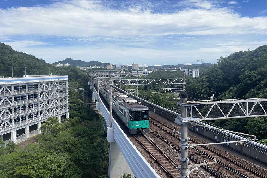 神戸市営地下鉄西神・山手線の電車が走る様子。眺望も良く、フォトジェニックな鉄道写真が撮影できます。
