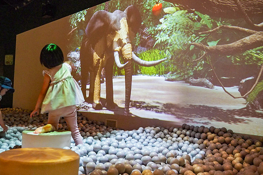 4つ目の「ジャングルエリア」はまず、体に泥をつけて虫や太陽から肌を守るゾウやカバのために、どろんこに見立てたボールを当ててあげる「どろんこジャングル」。大型スクリーンと連動したボールプールです。