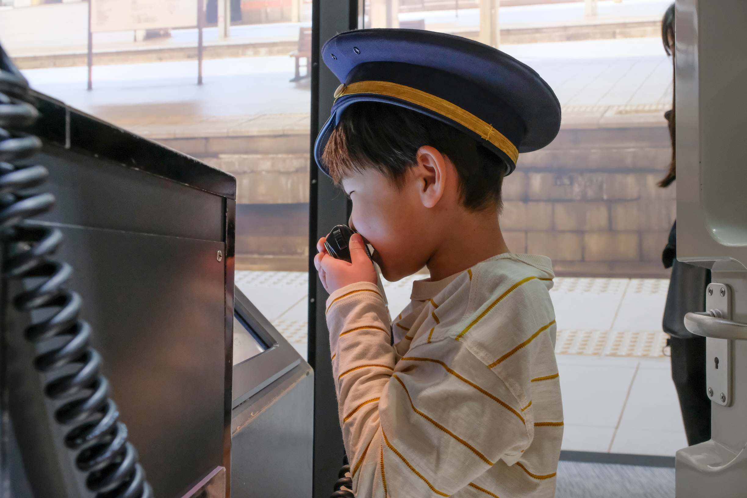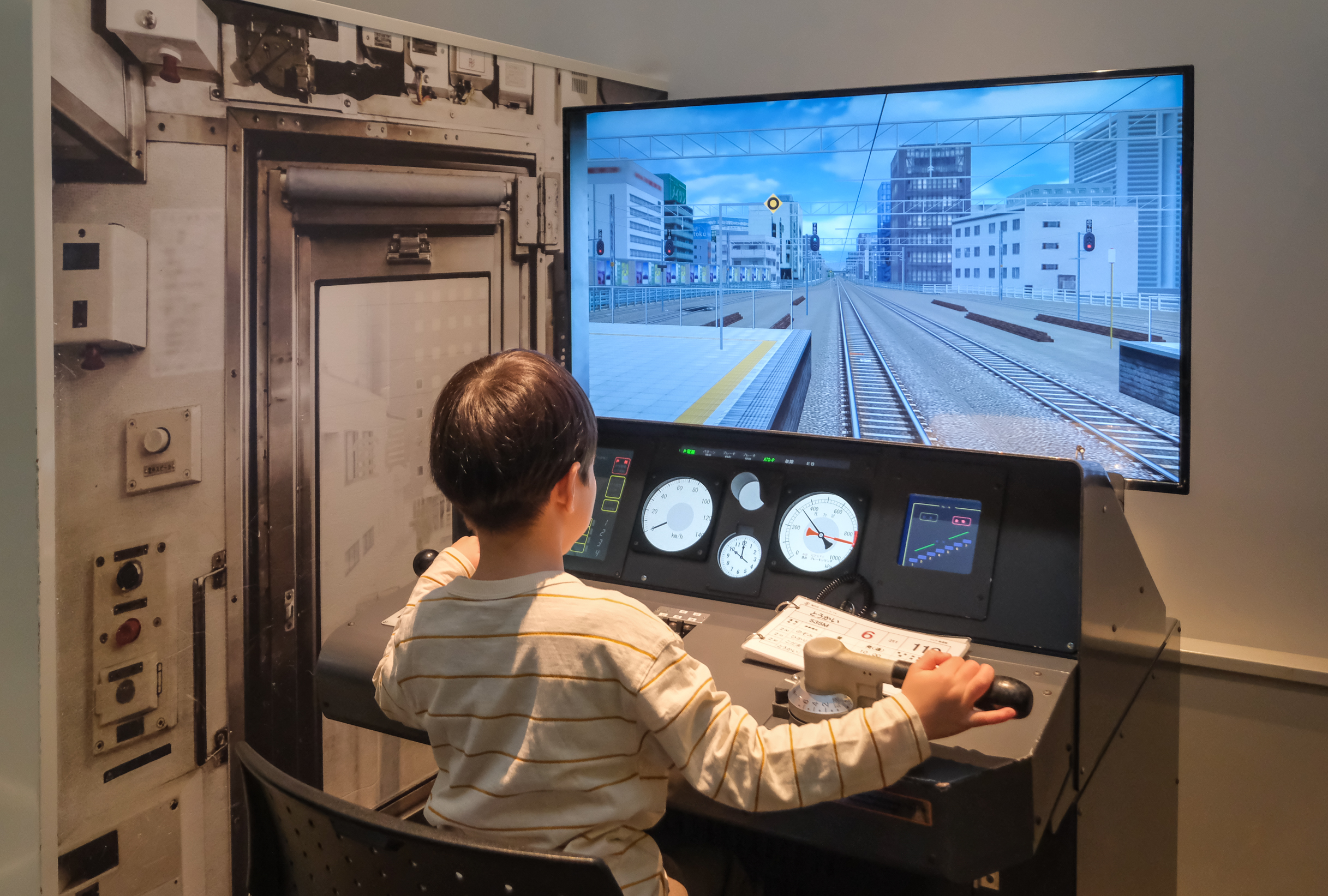在来線シミュレータ「車掌」の体験は子どもに大人気。車掌室からホームに開かれた視界そのままで、業務体験ができちゃいます。