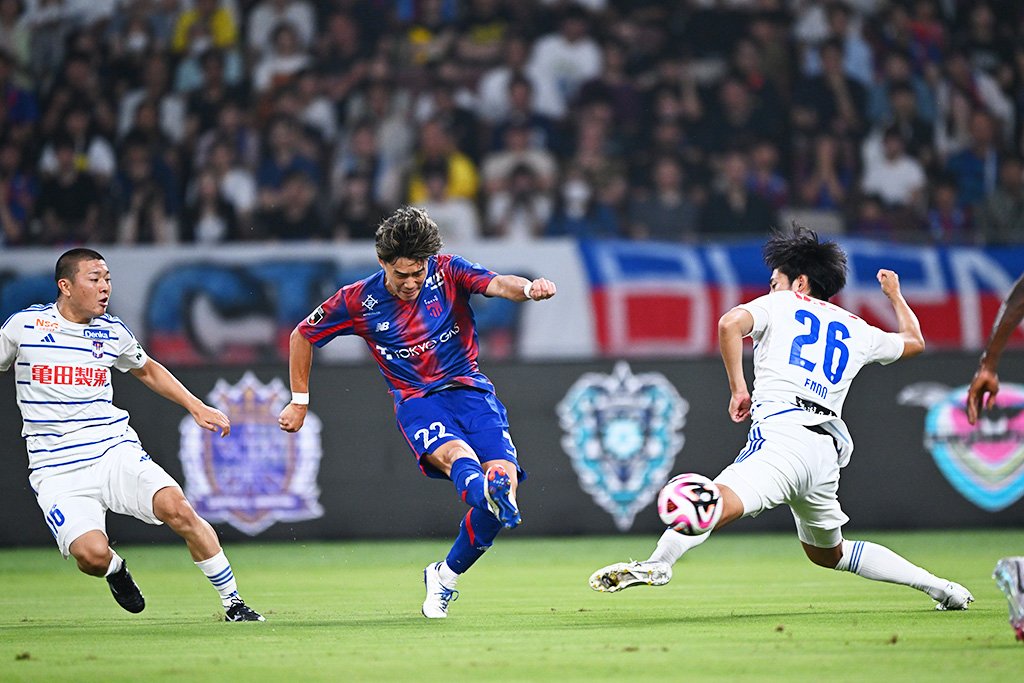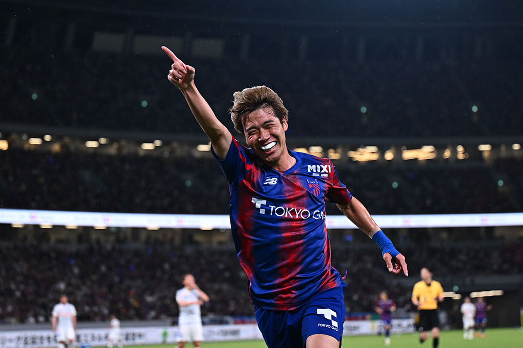 ホームチームとなるFC東京のゴールが決まり、喜びを爆発させる選手たち。57,885人の観客が来場したスタジアムに大歓声が響きます。たくさんの人と一緒に盛り上がれるのも、スタジアムでの生観戦ならでは!