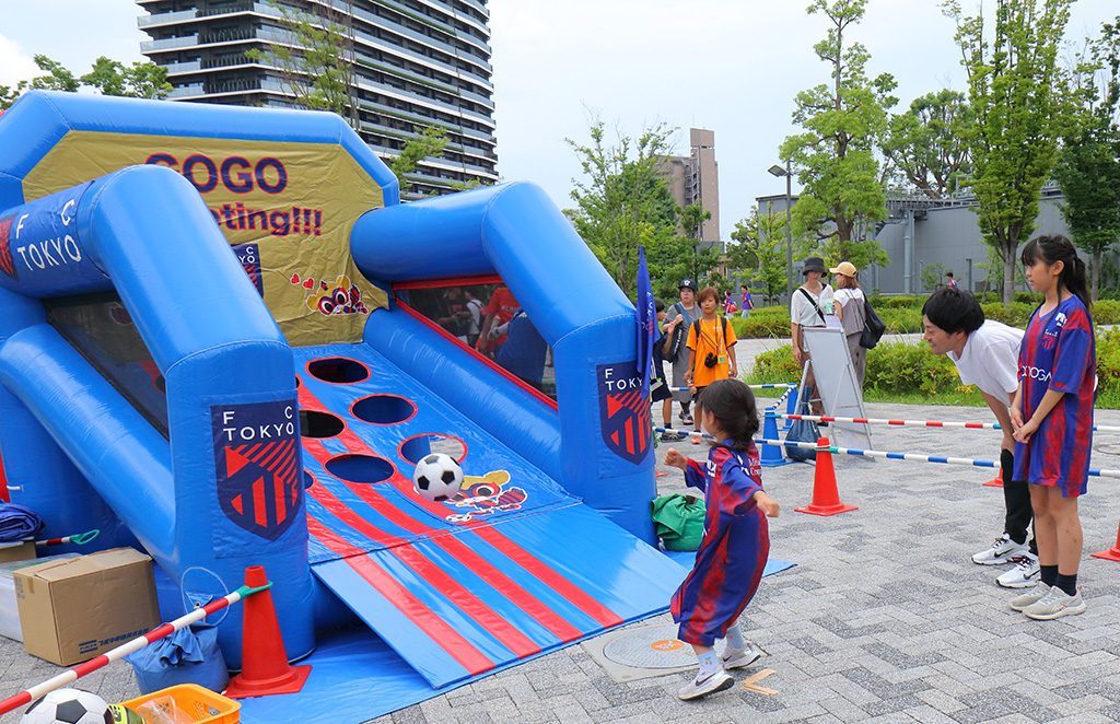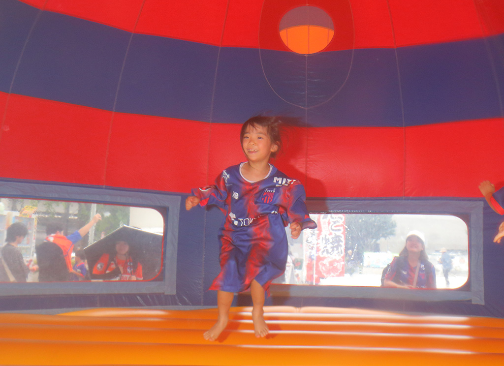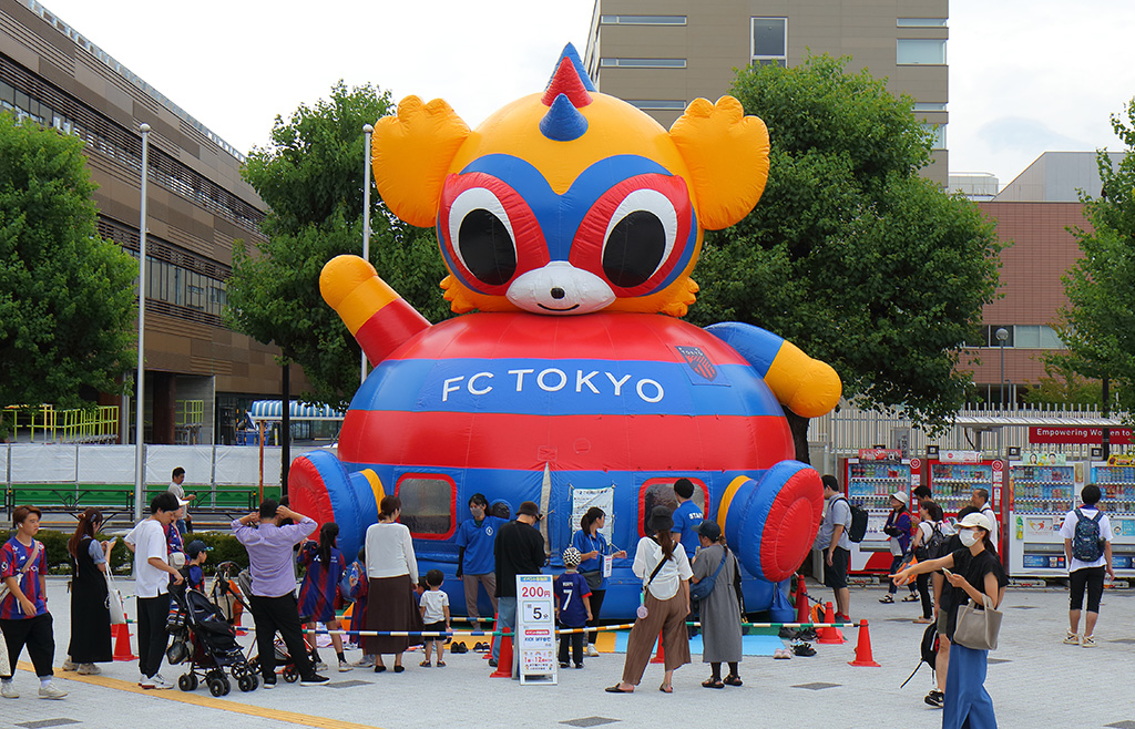 スタジアムには、キックオフ前から楽しめる子ども向けのアトラクションが用意されています。写真は、FC東京のチームマスコットである東京ドロンパの形をしたかわいらしいエアー遊具「東京ドロンパふわふわ」。FC東京のホームゲームでは定番の人気アトラクションです。