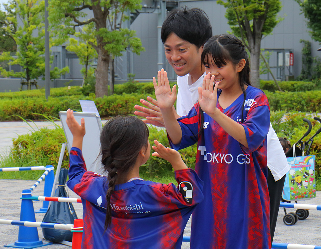 プロの選手みたいにシュートを決めてハイタッチ!見るだけでなく、気軽にサッカーに触れあえるのが嬉しいポイントです。