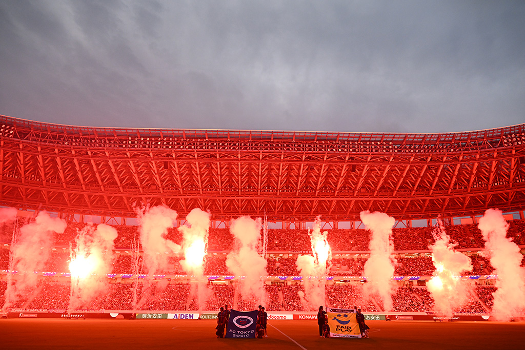 試合開始前は花火や青と赤の炎の演出も行われ、観客席の興奮は最高潮に!この日は、木村カエラさんのスペシャルライブや、今夏パリオリンピックに参加するFC東京の野澤大志ブランドン選手、荒木遼太郎選手に花束の贈呈が行われました。
