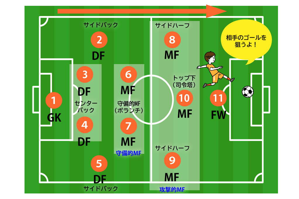 MFは攻撃的MFと守備的MFの2種類に分けられ、攻撃的MFはFWに近い位置でプレーするトップ下、サイドのエリアを主戦場とするサイドハーフ、守備的MFは攻守の起点として重要なボランチ、守備に専念するアンカーなど、役割が細かく分けられています。チームの中で一番、多くの人数が置かれやすいポジションです。