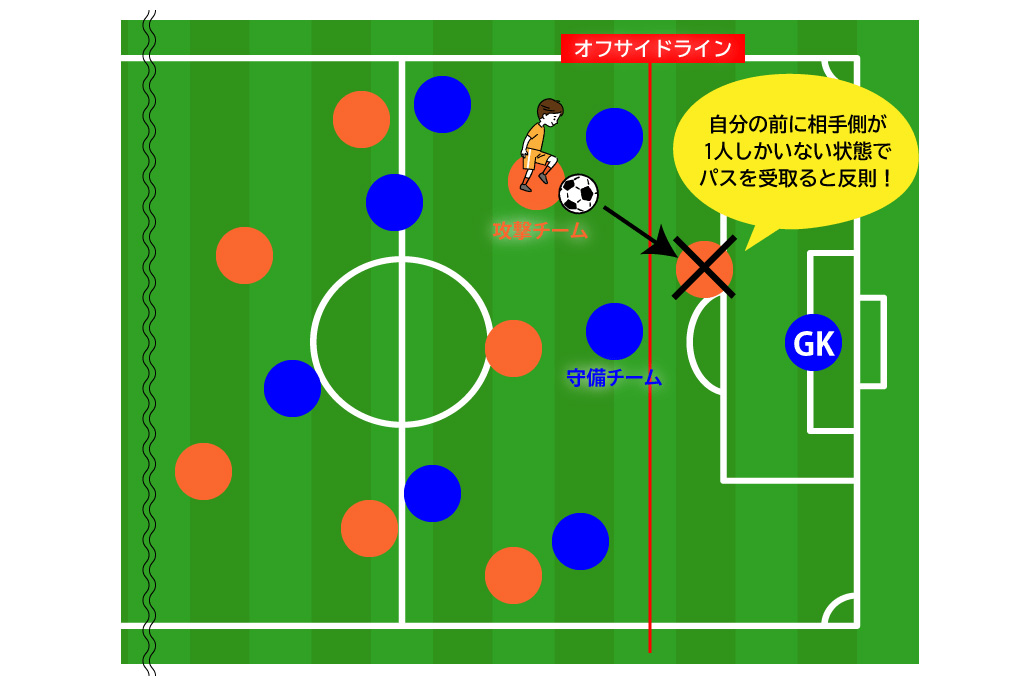 簡単に言うと「待ち伏せ禁止」ルールです。攻撃側がゴールを決めるために、守備側のチームのフィールド内(特にゴール前)で常に待っている状態を防ぐために定められたルールです。攻撃側が相手陣内で、パスを出したタイミングで自身の前に相手が一人しかいない状態でボールを受け取ると反則になります。