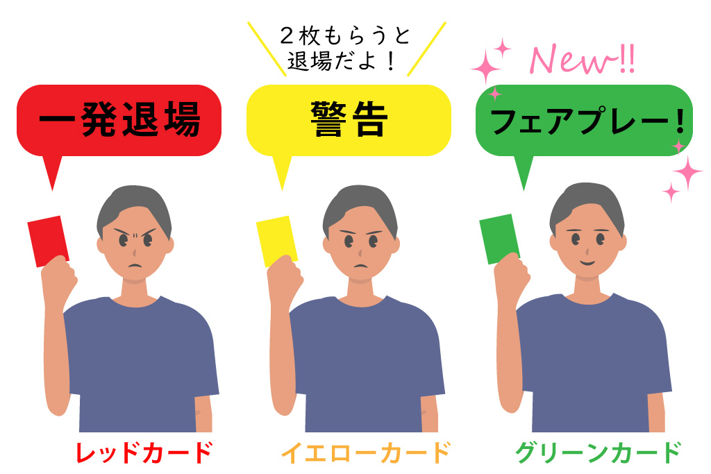 最近、新しくグリーンカードができました。怪我をした選手に思いやりを見せるなど、「フェアプレー、リスペクトのある行為」を試合中に行った選手に提示されます。特に加点に繋がることはありませんが、ゲームの勝負だけではなく、フェアプレーの精神を称えることも、スポーツの良い一面と言えるでしょう。