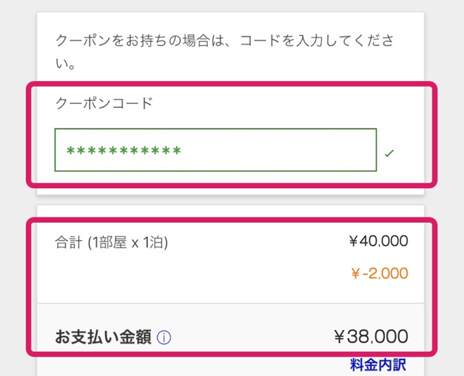 予約の際は、クーポンコード欄にコードが入力されていることと、割引内容欄を確認してください。