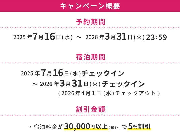 - 宿泊期間:2025年7月16日(水)チェックイン~2026年3月31日(火)チェックイン(2026年4月1日(水)チェックアウト)まで
