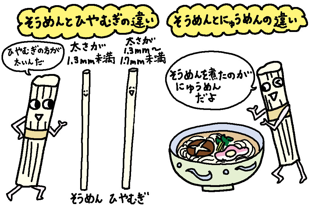 「そうめん」と「ひやむぎ」の違いは、太さです。基本的に直径1.3mm未満なら「そうめん」、直径1.3mm~1.7mm未満なら「ひやむぎ」と呼びます。ただし手作業で作られる「手のべ干しめん」は、丸棒状で直径1.7mm以下であればそうめんと記載でき、徳島県の名産「半田そうめん」のように、ひやむぎと同じ太さのそうめんも存在します。