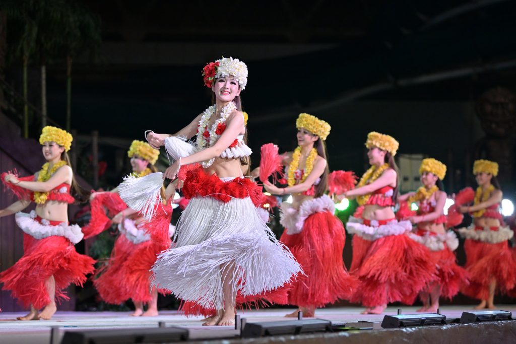 スパリゾートハワイアンズといえばフラダンス!「ポリネシアン・グランドステージ」ではフラダンスはもちろん、迫力あるサモアのファイヤーナイフダンスや情熱的なタヒチアンダンスなど、ポリネシア諸島のダンスを間近で鑑賞できます。