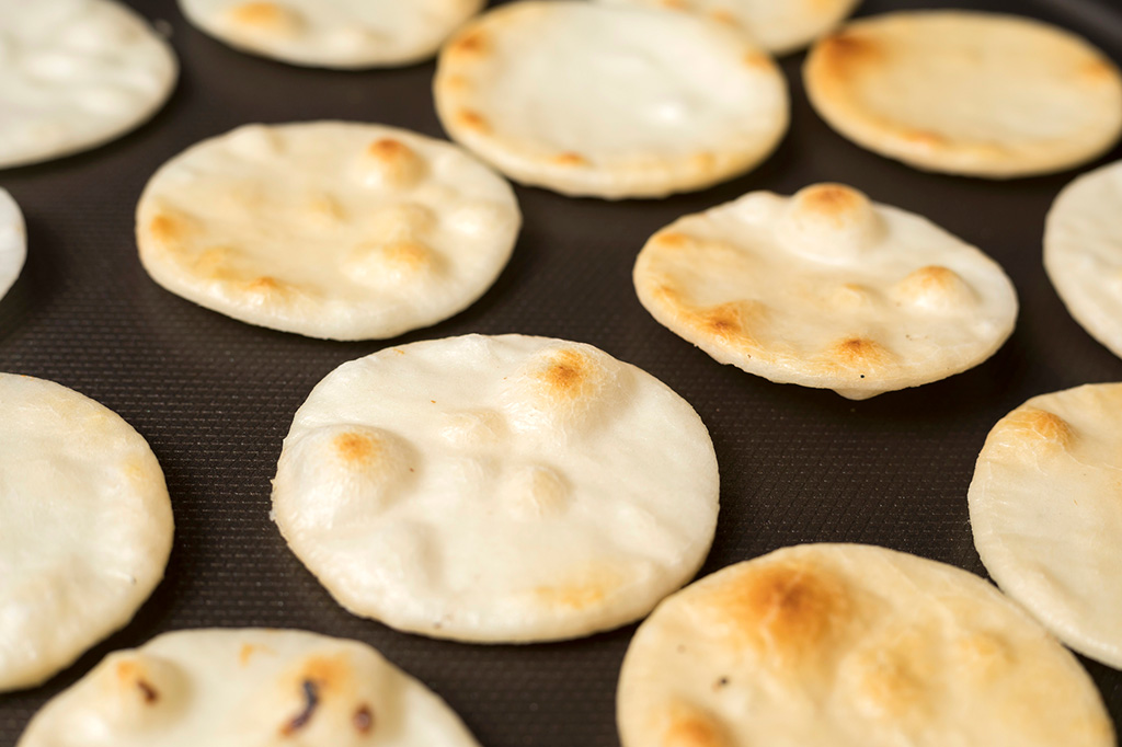 うるち米を乾燥させて粉状にした上新粉と好みの調味料で、定番せんべいを作れます。生地を作ったら、2~3日干すのがポイント。乾くと半透明になります。しっかり乾燥させないと、焼いたときに膨らまなかったり、硬くなり過ぎたりするのでご注意を。