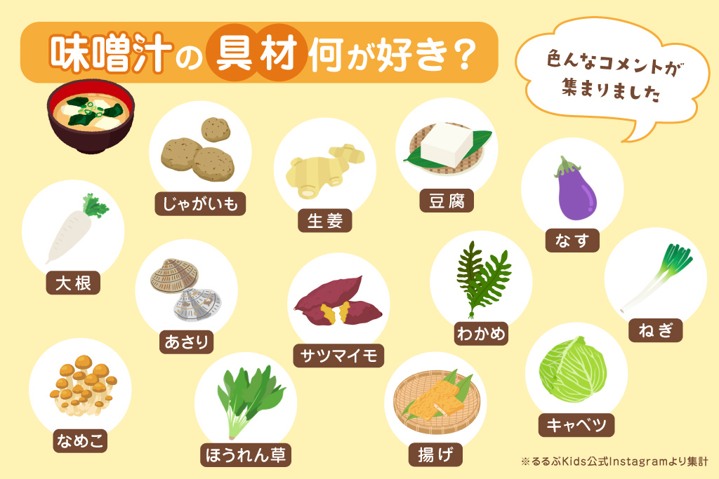 るるぶKidsでアンケートを取ったところ、わかめ、油揚げ、豆腐、なめこといった定番具材がやはり人気!野菜だと大根、じゃがいも、サツマイモ、なす、キャベツなど、こちらもどんな組み合わせでも美味しい具材にコメントが多く寄せられました。