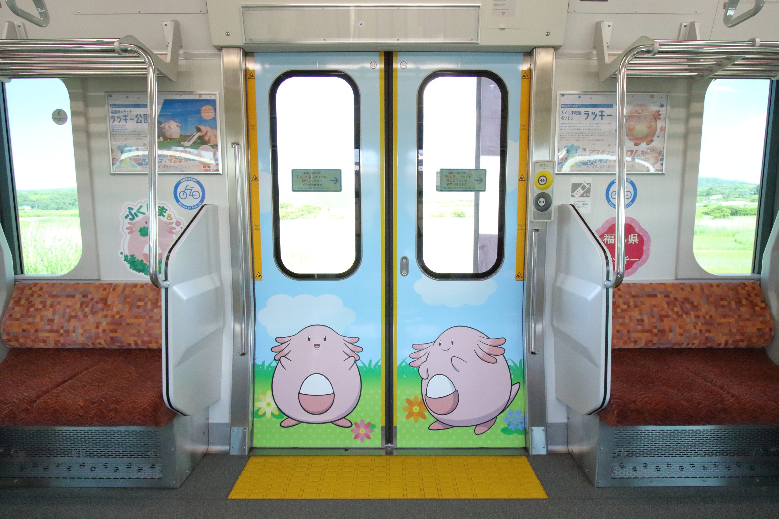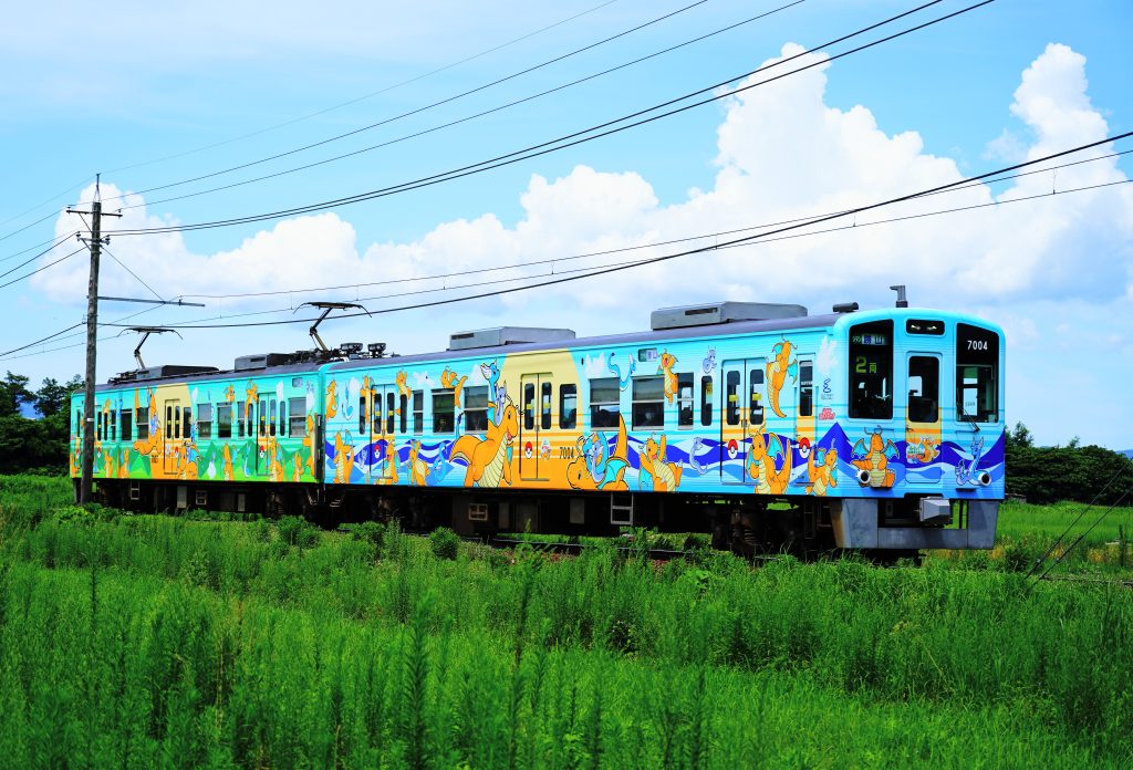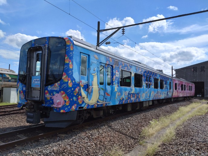 宮城県と福島県を結ぶ、鮮やかなブルーとピンクが目を引くラッピング電車です。宮城県側のブルーの車両にはラプラス、福島県側のピンクの車両にはラッキーがデザインされています。6つの駅に設置された顔出しパネルは記念撮影にぴったり!運行情報は公式サイトを要チェック。