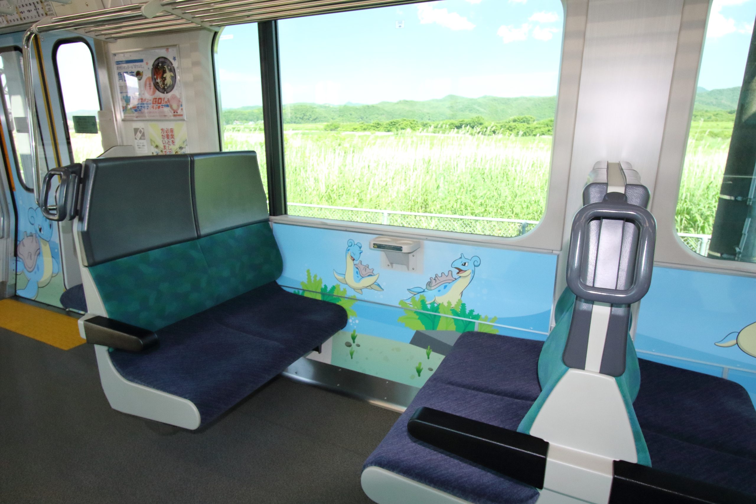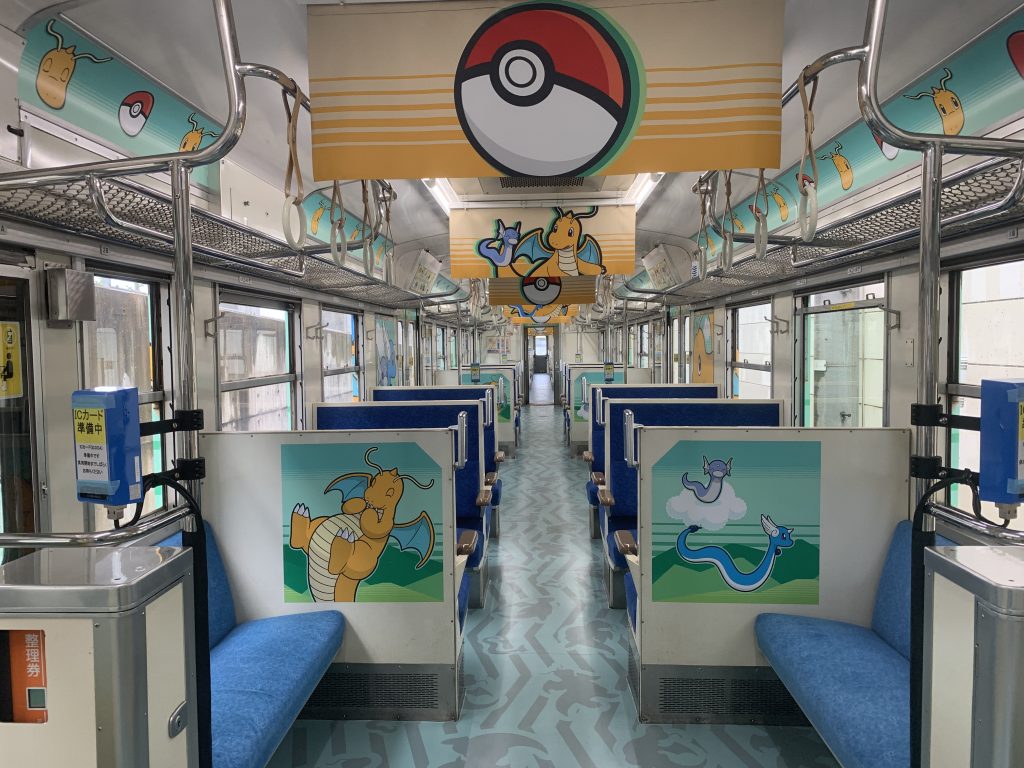 山をイメージし、緑を基調とした車両。カイリューのイメージカラー・オレンジの中吊りが映えます。床は山の稜線を思わせる線模様です。