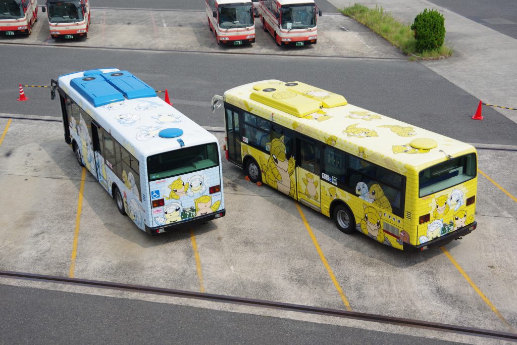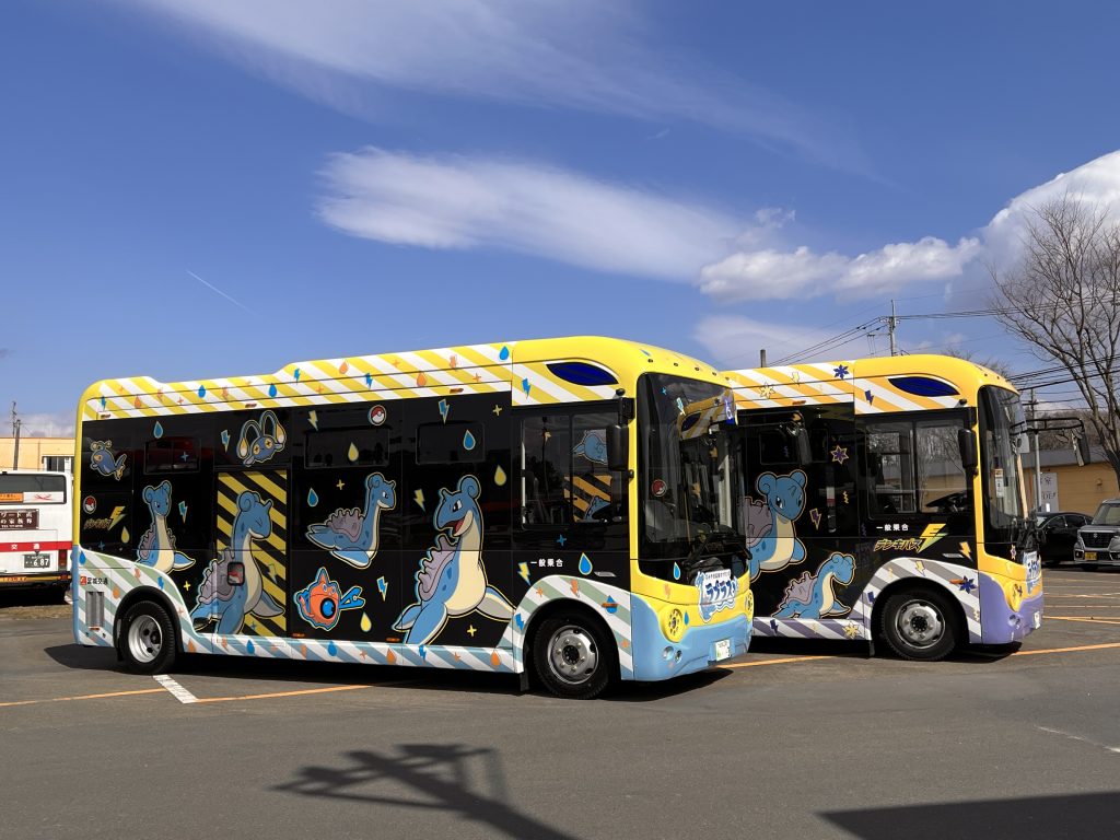 環境にやさしいEVバスの、ラプラスのラッピングバス。2台のバスのうち、1台にはみず・でんきタイプ、もう1台にはこおり・でんきタイプのポケモンが、ラプラスと一緒に描かれています。仙台駅前から仙台中心部を循環、20分おきに運行しています(一部時間帯を除く)。1乗車120円。