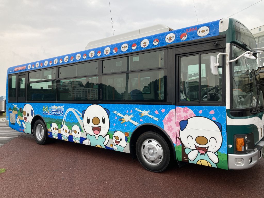 伊勢市と鳥羽市ではミジュマルのラッピングバスが運行中。伊勢市では電気バスが大型1台、小型2台が運行しており、内装もミジュマルデザインになっています。