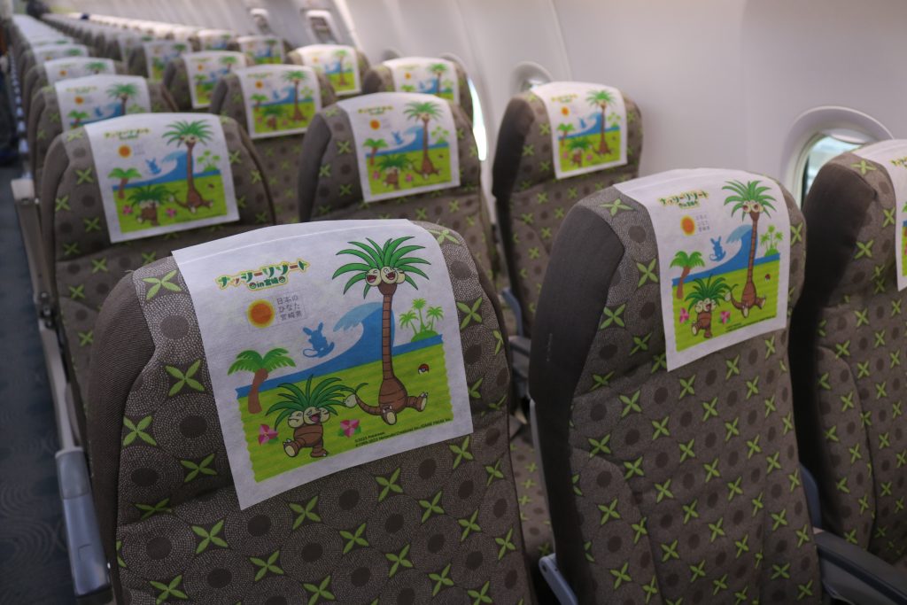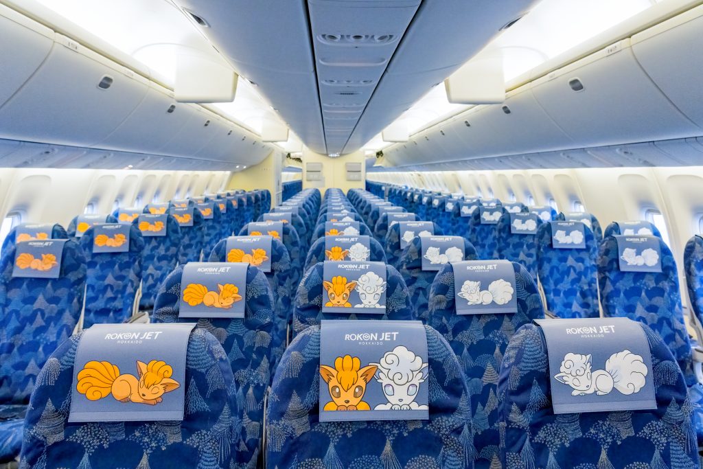 3種類のヘッドレストカバーがあり、A・B・C席はアローラロコンが、E・F・G席はロコンがくつろいでいる様子をデザイン。中央のD席と37列目は2匹が顔を覗かせています。