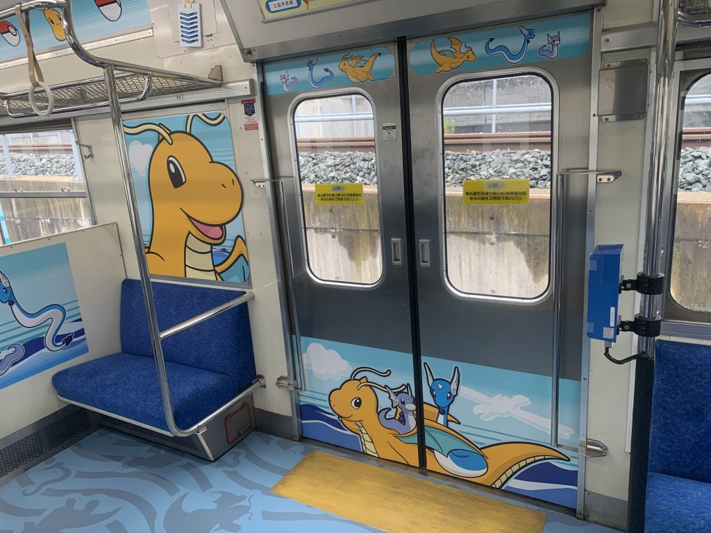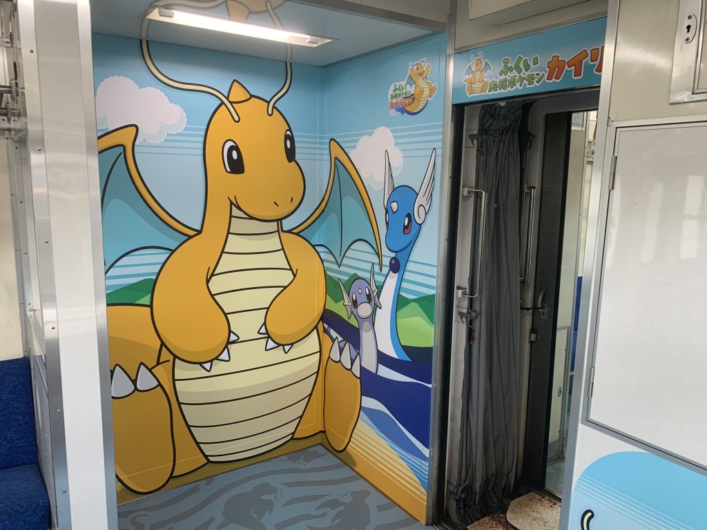車両の連結部分の近くにあるフォトスポットで記念撮影をしましょう。カイリューとその進化前のポケモン、ミニリュウ、ハクリューも勢ぞろい。