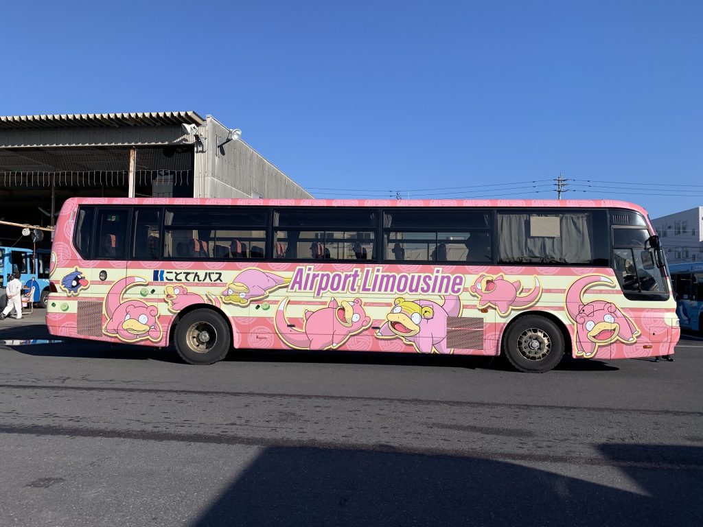 高松市中心街や丸亀市、愛媛県四国中央市などと高松空港を結ぶ空港リムジンバスがヤドンのラッピングに。4台のバスが運行中。うどんの具や名所などデザインは異なります。