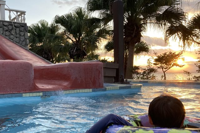 海風も吹いているので、屋内プールで濡れた体に12月の外は正直寒いです。ですが、入ってみると、プールは約40℃で驚くほど快適!そして夕方にはサンセットの絶景が目の前に広がっていて、眺めながら泳げます。これには感動しました。