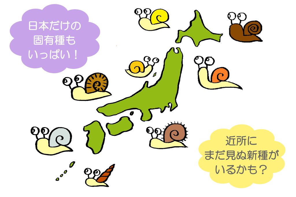 一説によると、日本特有の湿度が高くジメジメした気候がカタツムリの生育に適していたことに加え、もともと動きが遅く、長距離移動ができないというカタツムリの性質が影響して、日本各地それぞれの地域に住むカタツムリたちが独自の進化をとげていったためだと考えられています。