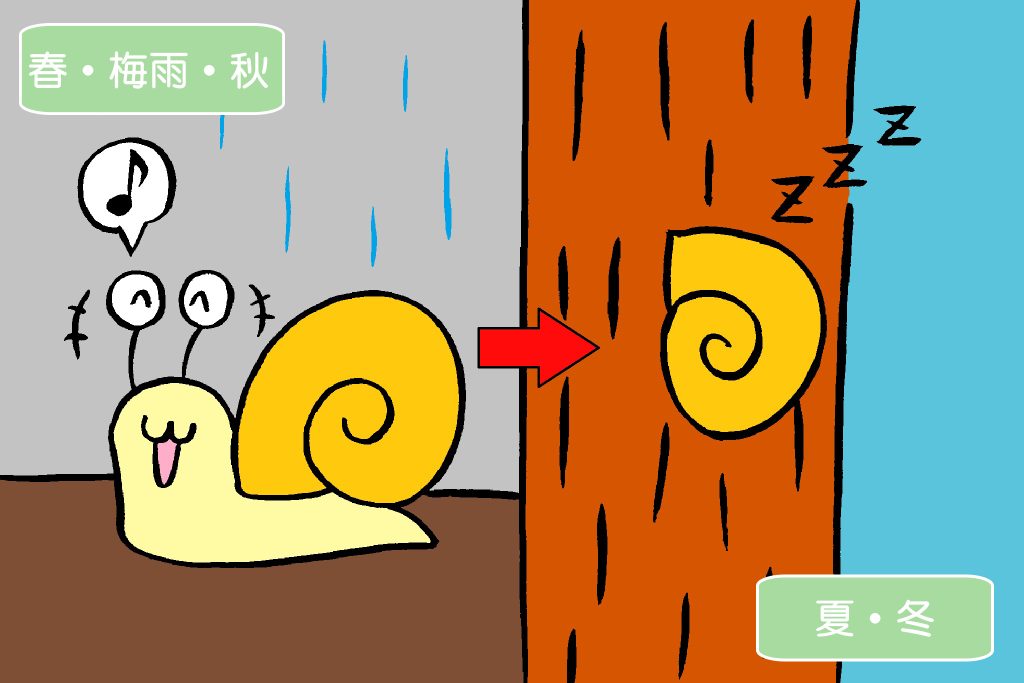 乾燥の激しい夏や寒い冬は、カタツムリは休眠期間に入るので、この時期にカタツムリを採集するのは簡単ではありません。ただ、夏は木の幹や葉の裏、冬は落ち葉の下で眠っていることが多いので、このような場所を注意深く探すと見つけられることがあります。