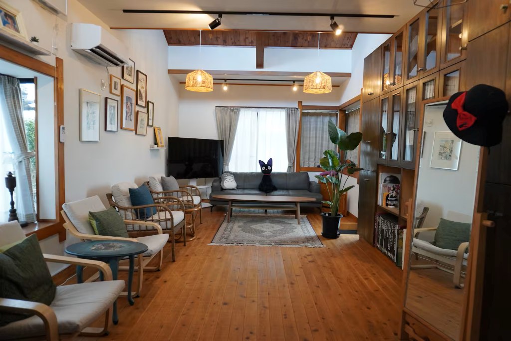 「泊まれる美術館」がコンセプトで、アトリエを改装して作られた一棟貸し宿。部屋のいたるところにジブリ作品にちなんだアイテムやイラストが並び、パークに行く前・行った後もジブリの世界観を存分に楽しむことができます。18畳の大きなリビングと、寝室が6部屋あるため、お友だち家族との旅行にもおすすめです。