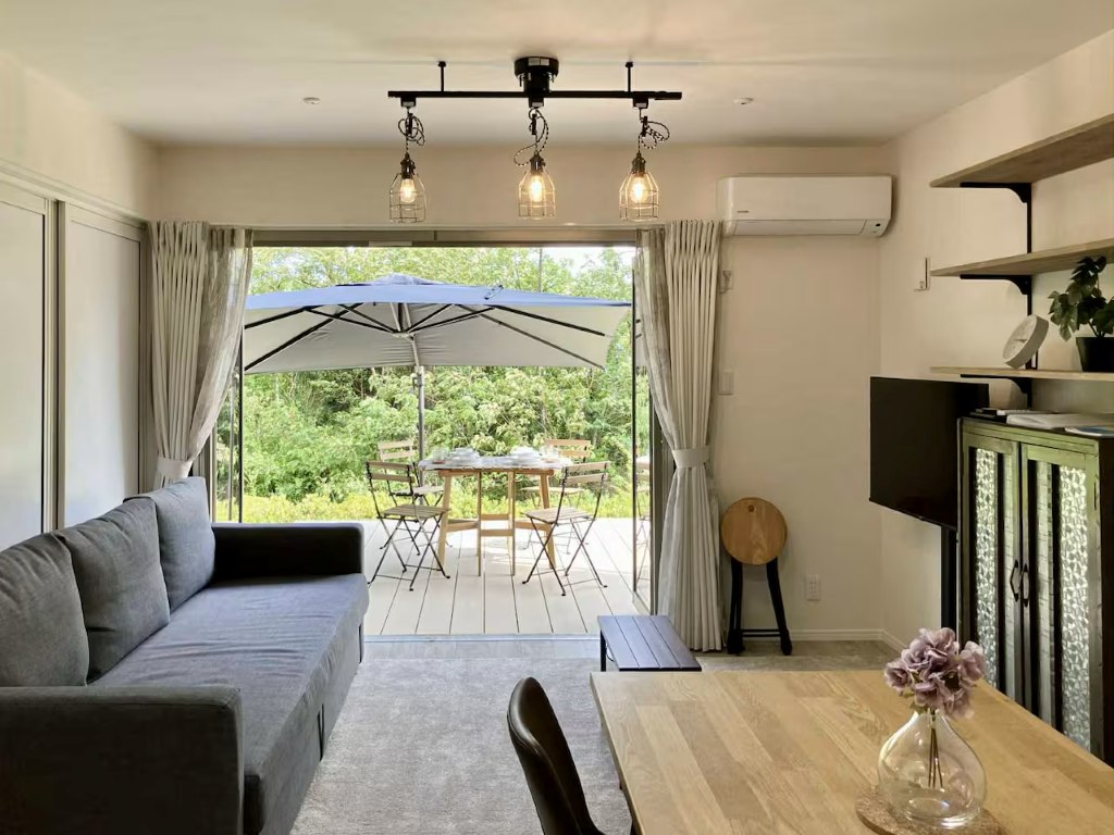 ジブリパークのすぐそばにある、2LDKのマンションタイプの貸切宿。内装はシンプルモダンでカフェのような居心地の良い空間です。リビングからつながるウッドデッキではBBQをすることが可能。寝室は防音使用になっており、グランドピアノの演奏を楽しめます。リクエストをすればバウンサーやベビーカーなどの子ども向け設備のレンタルもできるのがうれしいポイントです!