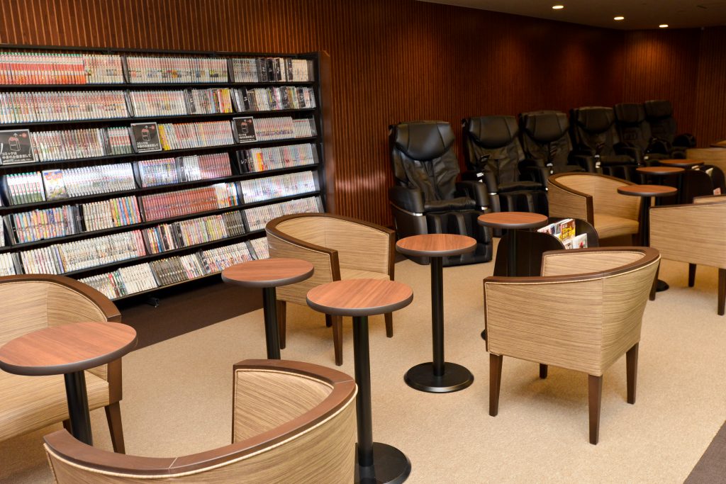 約5500冊の人気漫画や、雑誌も読み放題の「ブックスラウンジ」も魅力。マッサージチェアがあり、自由に利用できます。