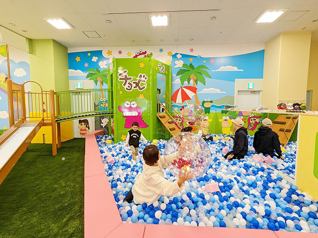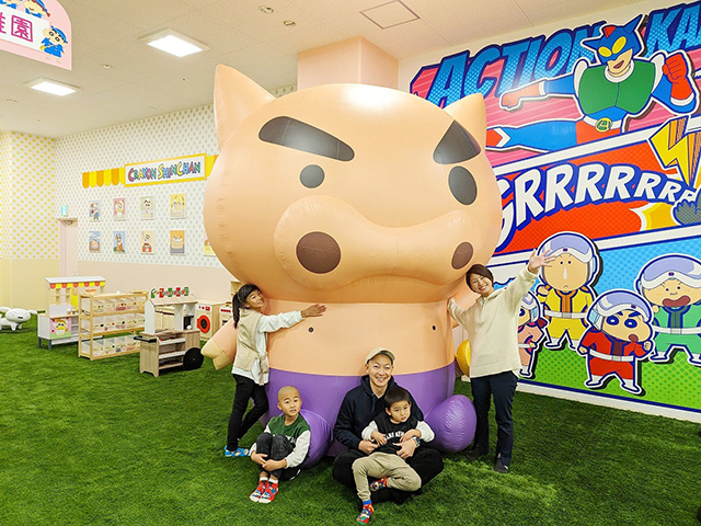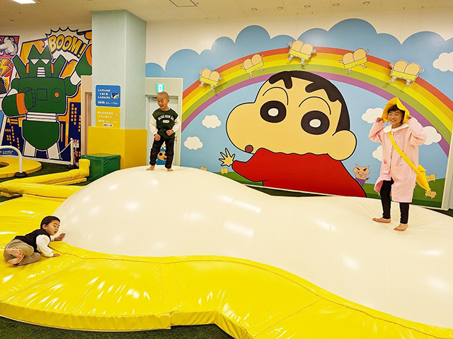 人気アニメ「クレヨンしんちゃん」がテーマの室内アトラクションパーク。「クレヨンしんちゃん」のグッズのショップも併設する。巨大な「チョコビ」型の複合遊具やしんちゃんのお尻型トランポリン、巨大なキリンの滑り台、室内でも走り回れる芝生広場などがあり、思いっきり体を動かして遊べる。高さ3メートルの「ぶりぶりさえもん」もインパクト大。シロの犬小屋をモチーフにした滑り台などの遊具があるベビースポットは、18ヵ月未満の乳幼児向け。ままごとやらくがきができるエリアもある。