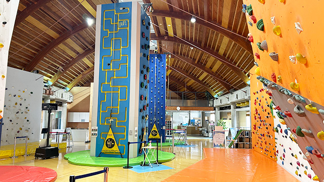 - ボルダリングウォール/幅12m、高さ4.5m、最大傾斜117度の迫力満点の壁。小学生から登れる。