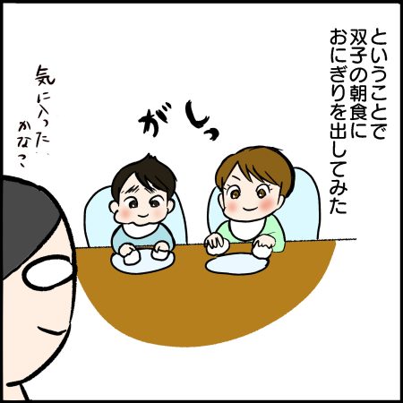 確かに長女も1歳前後からおにぎりを食べていました! 小さな手で一生懸命食べる姿って可愛いですよね。双子も同じように食べてくれるかな。早速、朝食に出してみました!