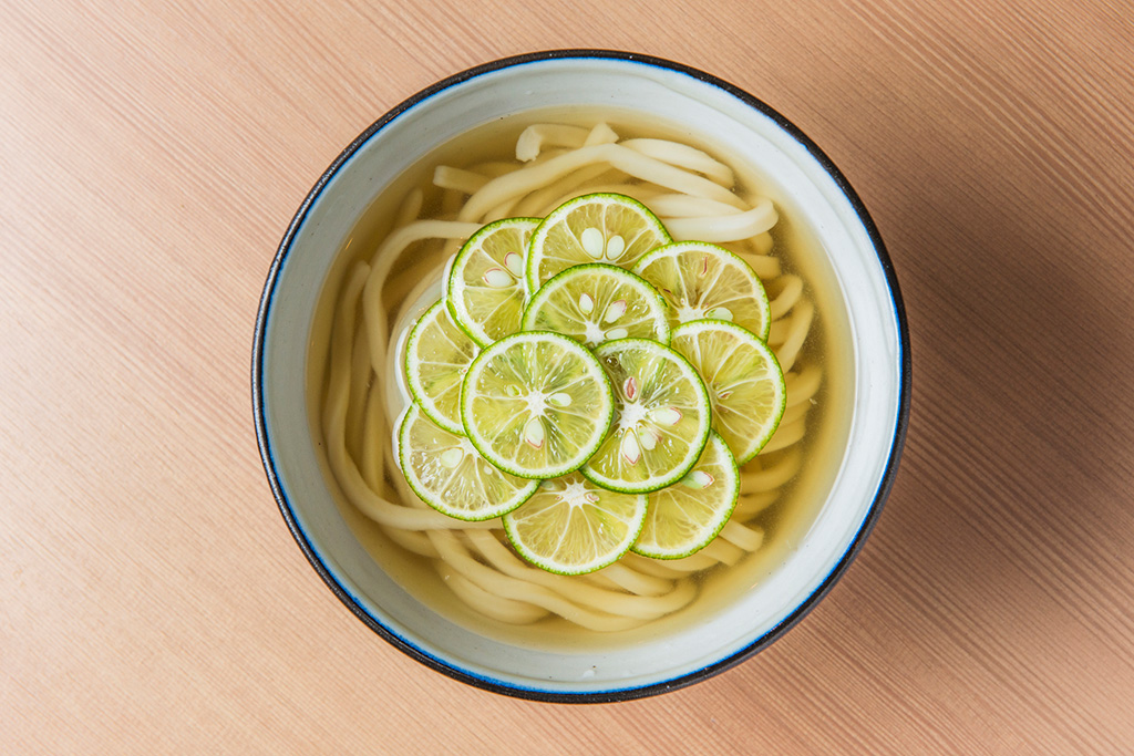 すだちは薄くスライスすることで、風味をより楽しめます。円を描くように盛り付けると、見た目もさわやかに。食べ方は、すだちを箸で潰し、香りや風味を汁に移します。すだち自体は食べずに残してOK。また、うどんは冷水で締めずに、温かいうどんにしても、おいしく食べられますよ。