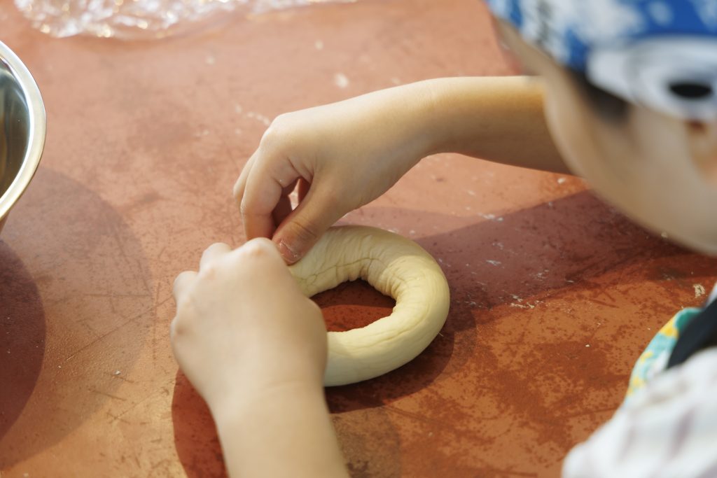 リング状に成型する工程が一番のポイント!みんな先生の説明を聞きながら、真剣な表情で輪っかを作ります。この間にも発酵が進むため、リングの穴は大きめに、そして炭酸ガスが抜けないように優しく手早く行うのがポイント。