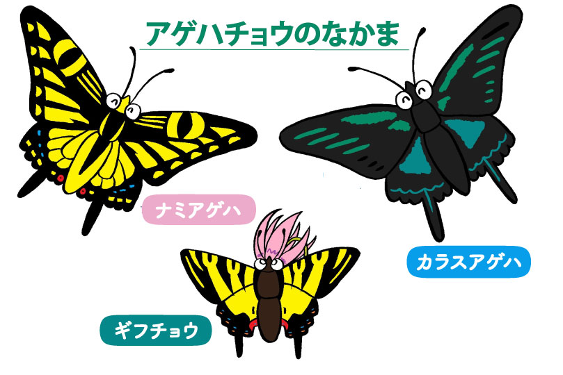 また、自然が豊かな地域の山の中では、ギフチョウという原始的なアゲハチョウの仲間を見ることができます。ギフチョウは限られた地域でしか見ることができない上に、春のはじめのわずかな時期にしか成虫が出現しない珍しいチョウなので、もし見ることができたらとてもラッキーです。