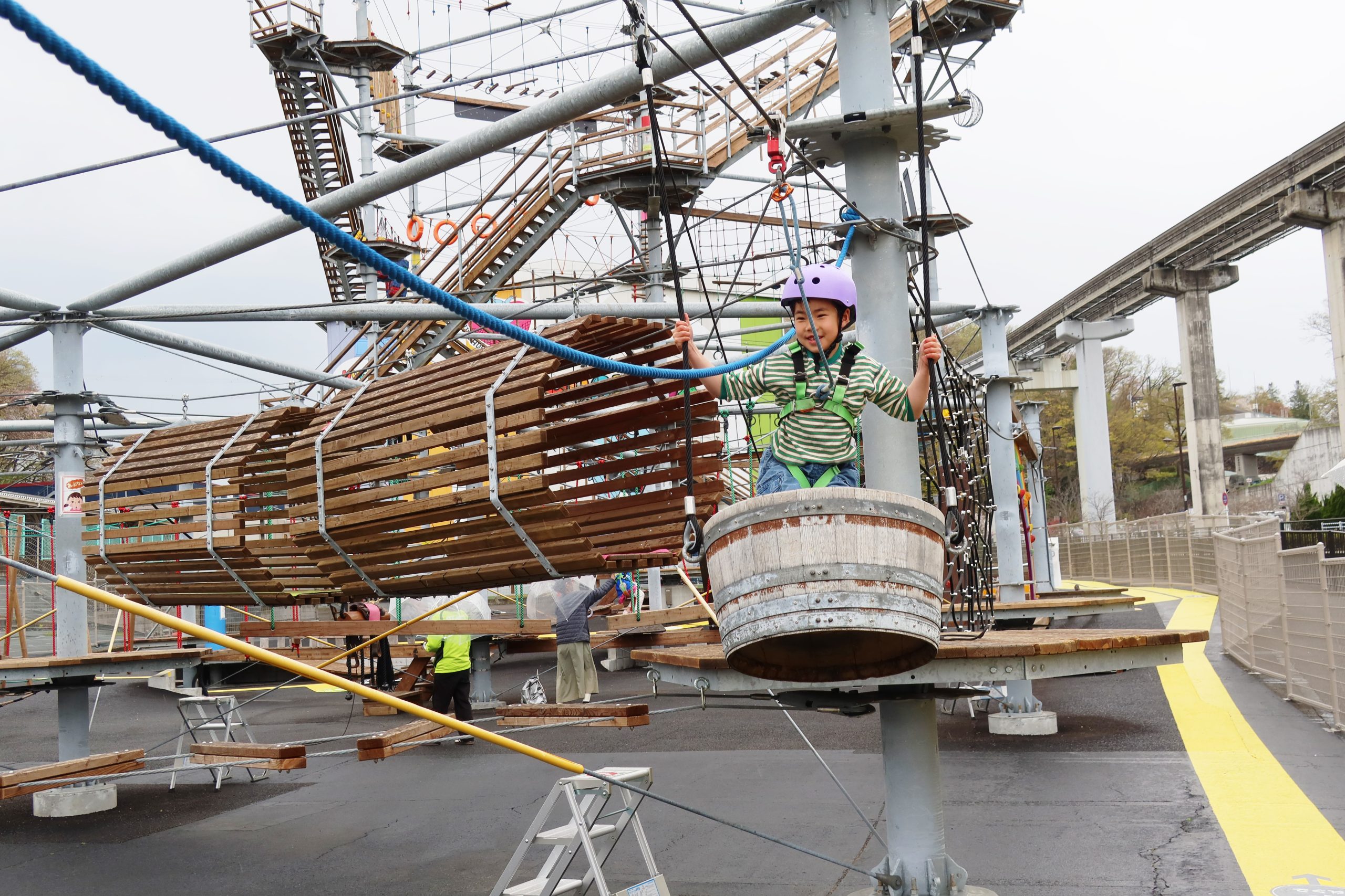 高さ約12m、直径約15mという日本最大級のネット遊具。4階層のネットの中には、雲のチューブやバランスボールなどの遊具があり、上に下にと縦横無尽に遊び回れます。まるで空中で遊んでいるかのよう。