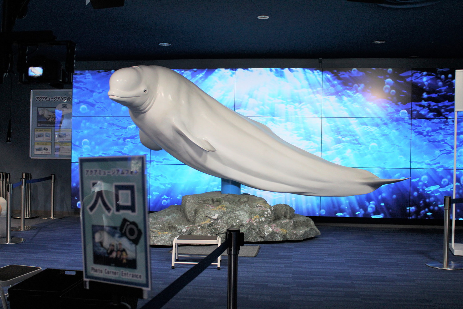 なお、水槽の隣には、ショーの人気者のシロイルカのレプリカとの記念撮影ブースがあります。海の仲間たちとの思い出として、記念撮影してもいいでしょう!